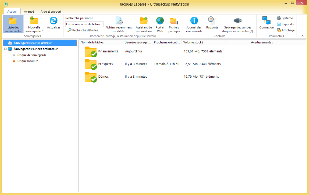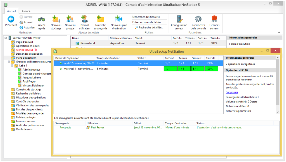 Chaque exécution des tâches déclenche la génération de rapports de sauvegarde détaillés qui incluent la liste complète des fichiers affectés par l’opération. Les rapports peuvent être consultés depuis le poste client ou la console d’administration serveur, et ils peuvent être envoyés automatiquement par e-mail aux utilisateurs ou à l’administrateur.