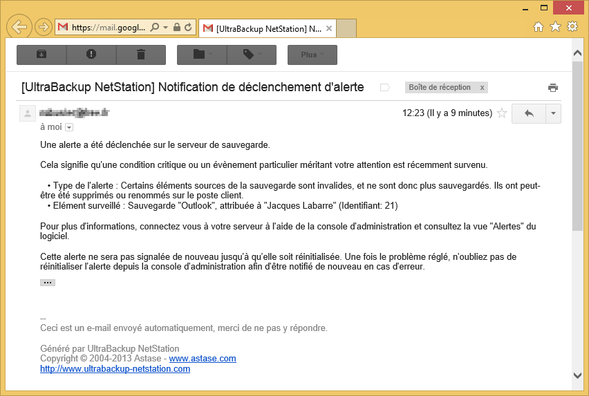 Recevez dans votre boîte mail des alertes transmises par le serveur dès que des conditions critiques sont atteintes. Vous êtes prévenus dès qu’un utilisateur atteint ses quotas, ne se connecte plus au serveur, que l’une de ses sauvegardes ne termine plus correctement ou référence des éléments qui n’existent plus sur son ordinateur. Pour une administration sereine et proactive.