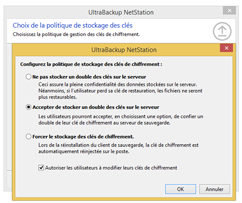 Les clés de chiffrement peuvent être configurées individuellement par profil utilisateur, et transmises ou non au serveur de sauvegarde. Dans le premier cas, l’administrateur peut récupérer des données utilisateur depuis le serveur de sauvegarde, dans le second cas les données stockées sont garanties indéchiffrables par l’administrateur ce qui satisfait certaines exigences en matière d’hébergement de données de corps de métiers spécifiques.